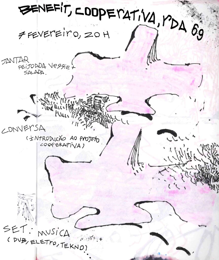 Dia 7 de fevereiro, após a incrível feirinha durante a tarde, mantemos a banca de 2ª mão e trazemos um Benefit para a Cooperativa. Começamos pelas 20h, com uma conversa aberta introdutória ao projeto Cooperativa. Ao jantar servimos uma feijoada veggie com arroz e salada a acompanhar. A fechar a noite um dj set do Música que traz dub, dusbtep, jungle e tekno